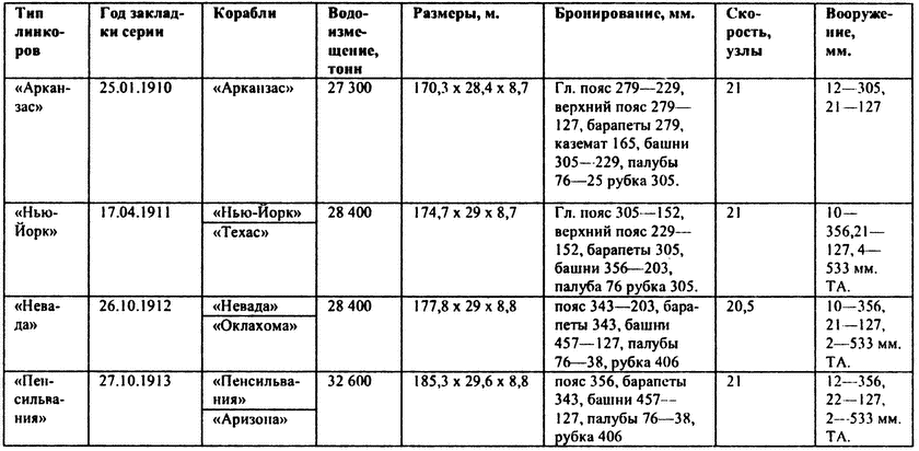 Поименный состав линейного флота США на 07.12.1941 г. был следующим: «Арканзас», «Техас», «Нью-Йорк», «Невада», «Оклахома», «Аризона», «Пенсильвания», «Айдахо», «Нью-Мексико», «Миссисипи», «Калифорния», «Теннесси», «Колорадо», «Мериленд», «Вест Виржиния», «Вашингтон», «Норт Каролина». Спущены на воду были: «Массачусетс», «Саут Дакота», «Индиана» — все вступили в строй в первой половине 1942 г. На различных стадиях строительства находились линкоры: «Алабама», «Айова», «Нью Джерси», «Миссури», «Иллинойс». (Прим. авт.)