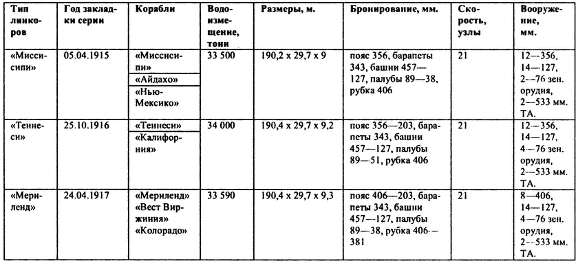 Американский флот был молодым, основную часть его кораблей составляли суда, построенные за последние пять лет, плохо дела обстояли с офицерским корпусом и с практическим опытом. Отсутствие последнего, крайне необходимого при разработке новых проектов, заменили теорией. В Военно-морском колледже в Ньюпорте в ходе ожесточенных дискуссий и военно-штабных игр проверяли качества будущих кораблей. Неудивительно, что американские линкоры являли собой курьезное сочетание удачных и ошибочных решений. Ситуация усугублялась тем, что военно-морское министерство давало задания на строительство новой серии дредноутов, не дожидаясь достройки предыдущей. В подобных условиях было крайне сложно учесть недостатки, проявлявшиеся на кораблях лишь в процессе их испытаний и эксплуатации. Так, за относительно небольшой промежуток времени, с 1906 по 1921 г., в Соединенных Штатах были спущены на воду линкоры 10 типов. Четыре серии дредноутов с 305 мм орудиями главного калибра («Мичиган», «Делавэр», «Флорида», «Арканзас»), пять серий сверхдредноутов с 356 мм орудиями («Нью-Йорк», «Невада», «Пенсильвания», «Миссисипи», «Теннеси») и четыре стальных гиганта с 406 мм орудиями типа «Мериленд». До некоторой степени проблему сглаживал тот факт, что большинство серий имело всего по два корабля, а между собой они отличались довольно слабо. Во многих других флотах мира несколько американских серий отнесли бы к одному типу. Так все «делавэры» и «флориды» практически не отличались друг от друга.