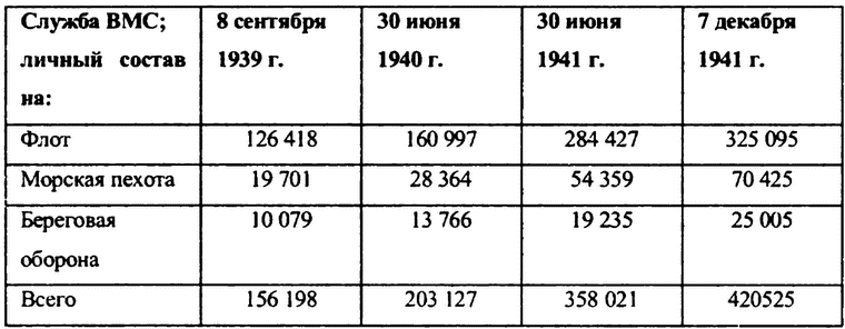 После введения президентом ограниченного военного положения в США 8 сентября 1939 г., в военно-морские силы стали призывать лиц, уволенных из флота, и практически полностью военно-морской резерв (примерно 100 000 человек). Если первая категория имела все необходимые навыки, которые необходимо было лишь освежить, то вторая — была пополнением крайне сомнительного качества. Члены резерва во флоте не служили и лишь изредка проходили тренировки во время летних больших маневров на кораблях — чаще в качестве туристов, но, к несчастью, они сразу зачислялись в экипажи. Подытоживая, можно сказать лишь одно — офицерам приходилось учить экипажи «на ходу», уже на кораблях и во время боевых действий. Суровая и очень дорогая школа.