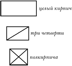 В любом случае, главной задачей является составление чертежей камина, на их основе делаются порядовки. Определившись с основными размерами камина в плане, следует обязательно выполнить послойные чертежи кладки, так называемые порядовки. Для их выполнения надо приготовить бумагу в клеточку. При сооружении камина приходится использовать целые кирпичи, а также половинки и три четверти, поэтому удобнее воспользоваться условными изображениями (рис. 18).