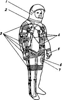 Схема строения скафандра мягкого типа. Цифрами обозначены: 1 — гермошлем; 2 — силовая оболочка, не позволяющая скафандру чересчур раздуваться; 3 — шарниры в местах сгибов; 4 — элементы силовой системы; 5 — гермоперчатка; 6 — герметичная оболочка; 7 — подкладка. Внешняя защитная оболочка на рисунке не показана.