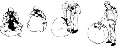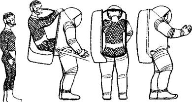 Герметическая оболочка для аварийной эвакуации астронавта и последовательность «упаковки» человека в нее.