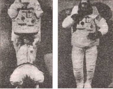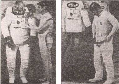 Американские скафандры первое время состояли из двух частей — верхней и нижней. На фотографиях показана последовательность облачения астронавта в такой скафандр.