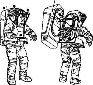 Устройство скафандра Г. Гриффина, предназначенного для Луны и Марса. Цифрами обозначены: 1 — сигнальный прожектор; 2 — фары освещения; 3 — видеокамера; 4 — радиоантенна; 5 — створки; 6 — наушники; 7 — приборы наблюдения; 8 — микрофон; 9 — спинной люк; 10 — жесткий корпус; 11 — ранец системы жизнеобеспечения; 12 — рукоятка открытия ранца-скафандра; 13 — плечевые замки; 14 — пояс; 15 — комбинезон для защиты от перегрева и микрометеоритов.