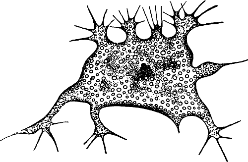 Клетки-пожиратели нападают на споры. Они словно прилипают к ним, а потом обволакивают их своим студенистым телом. Охваченная клеткой, спора изменяется: из иголочки она превращается в кучку бурых крупинок.