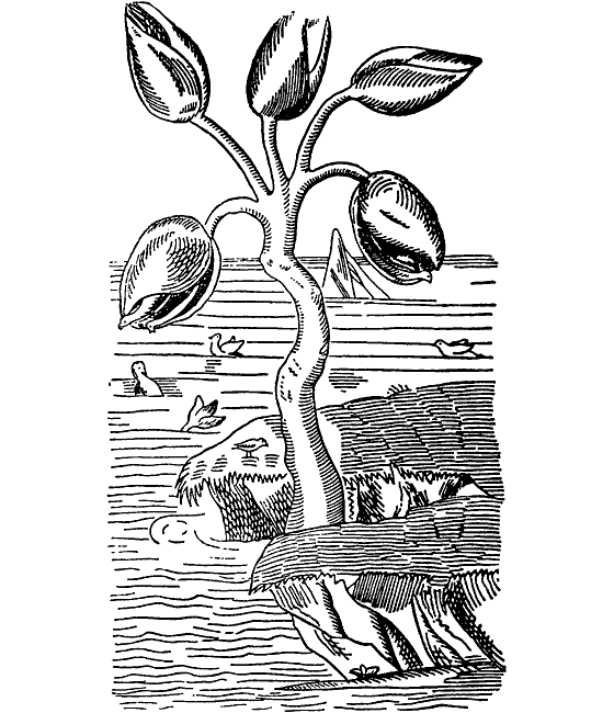 А рассказывал этот Геральдус презанятные вещи. Он описывал особого «Бернакельского гуся». Этот гусь якобы вырастал на обломках сосны, носящихся по морским волнам, и имел первоначально вид капелек смолы. Затем гусь прикреплялся клювом к дереву и выделял, ради безопасности, твердую скорлупу. Окруженный ею, он жил спокойно и беззаботно.