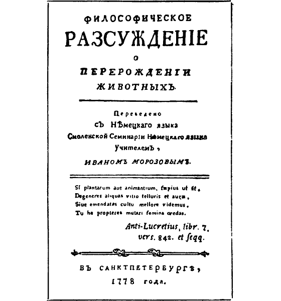 Сочинение Каверзнева было переведено на русский язык. Но вы напрасно будете искать его фамилию в справочниках и каталогах русских книг по естествознанию. В 1778 году в Петербурге была отпечатана книжка «Философическое рассуждение о перерождении животных. Переведено с немецкого языка Смоленской Семинарии учителем немецкого языка Иваном Морозовым». Фамилии автора на книге нет.