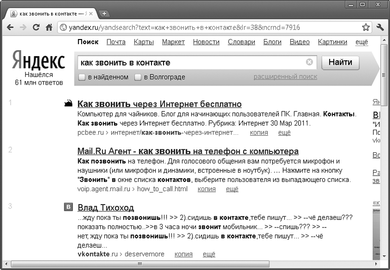 Рис. 5.3. Выдача «Яндекса» по запросу «как звонить в контакте»