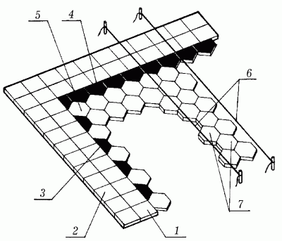 Рис. 49. Укладка шестигранных плиток: 1 – фризовый ряд; 2 – заделочный ряд; 3 – четырехгранные половинки; 4 – пятигранные половинки; 5 – шестигранные плитки; 6 – причальные шнуры; 7 – маячные ряды.