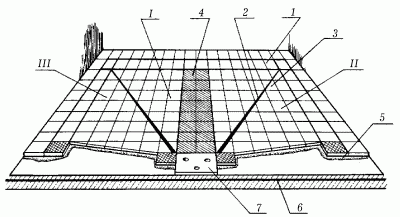 Рис. 51. Облицовка наклонного пола способом «в конверт»: 1 – фризовые ряды; 2 – линии разруба; 3 – неполномерные плитки; 4 – маячные ряды; 5 – прослойка раствора; 6 – гидроизоляция; 7 – решетка стока; I, II, III, IV – укладка плитки по треугольникам.