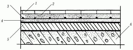 Рис. 52. Теплый пол с керамической плиткой: 1 – паркет (полипокрытие, керамическая плитка); 2 – утеплитель; 3 – греющий провод в цементной стяжке (1–2 см); 4 – гидроизоляция, экран из фольги; 5 – пароизоляция; 6 – плита перекрытия.