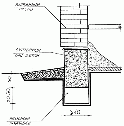 Кирпичный фундамент представляет собой кирпичную кладку из обыкновенного, обожженного кирпича на цементном или же на цементно-песчаном растворе. Толщина кирпичного фундамента зависит от размера используемого кирпича – 38, 51 и 64 см. Кирпичный фундамент в обычном строительстве используется крайне редко из-за дороговизны и недолговечности вследствие недостаточной водостойкости. Кирпичный фундамент, как правило, устраивают только на сухих грунтах и при наличии недорогого кирпича в достаточном количестве. Чаще всего в строительстве применяются бетонные и бутобетонные фундаменты (рис. 24).