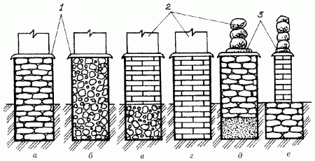 Рис. 24. Устройство фундаментов из различных материалов: а – бутовый; б – бутобетонный; в – кирпичный по бутобетону; г – кирпичный; д – бутовый на песчаной подушке; е – кирпичный по буту; 1 – гидроизоляционный слой; 2 – стены; 3 – подкладка.