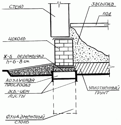 При устройстве столбчатых фундаментов обращают внимание на необходимость устройства цоколя или забирки в промежутке между столбами. Делают ее разными способами. На рис. 25 показан вариант фундамента с теплым подпольем и кирпичным цоколем, который опирается на перемычку, уложенную поверх столбов. Верх столбов находится ниже отметки земли на 10–15 см. Железобетонную перемычку выполняют в деревянной опалубке в виде установленного от столба до столба желоба. На дно этого желоба укладывают 3-сантиметровый слой раствора и стальную арматуру из 3–4 прутьев сечением не менее 10 мм. Концы прутьев сгибают крючком. Арматуру закрывают сверху слоем раствора не менее 5 см. В этом варианте фундамента большое значение имеет воздушная прослойка между перемычкой и грунтом основания, предохраняющая цоколь от давления вспученного грунта, плотно прижатые с обеих сторон к перемычке асбестоцементные листы закрывают эту воздушную прослойку от осыпания грунта. Кстати, большинство проблем, с которыми сталкиваются через 1–2 года после строительства дома, связаны именно с незнанием этой особенности устройства цоколя (рис. 25).