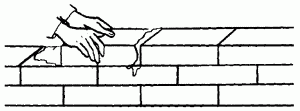 Движением вверх правой руки вынимают кельму, а кирпичом, придвигаемым левой рукой, зажимают раствор между вертикальными гранями укладываемого и ранее уложенного кирпича. Нажимом руки осаживают уложенный кирпич на растворной постели. Избыток раствора, выжатый из шва на лицо кладки, подрезают кельмой за 1 прием после укладки тычками каждых 3–5 кирпичей или после укладки ложками двух кирпичей.