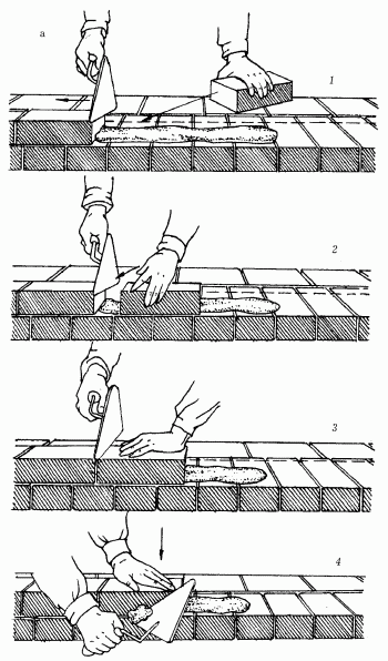 Раствор каменщик набрасывает на растворную постель. Кладка получается прочной, с полным заполнением швов, плотной и чистой. Однако этот способ требует большего количества движений, чем другие, и поэтому считается наиболее трудоемким.