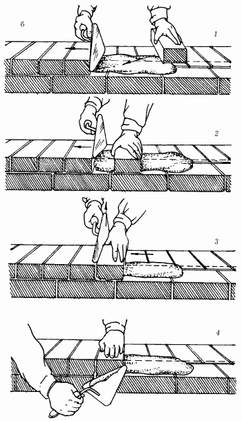 Рис. 55. Кладка кирпичей способом вприжим: а – ложкого ряда; б – тычкового ряда; 1–4 – последовательность действий.