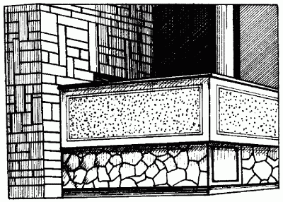 При строительстве частных домов часто используют сочетание кладок (рис. 70). Например, классическая кладка стены дома из колотого камня сочетаются с мозаичной кладкой цоколя, а цоколь одновременно является стеной подвала.