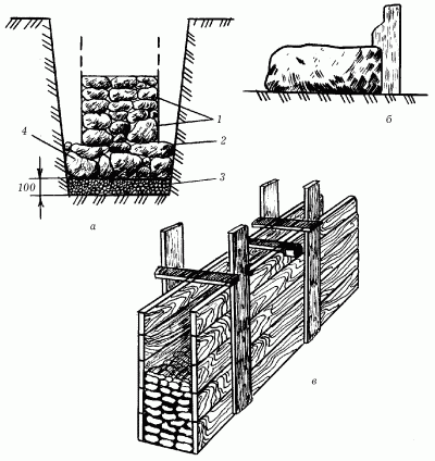 Рис. 71. Виды бутовой кладки: а – под лопатку; б – под скобу; в – под лопатку с приколкой лицевой поверхности; 1 – перстовые камни; 2 – раствор; 3 – щебеночное основание; 4 – постелистые камни.