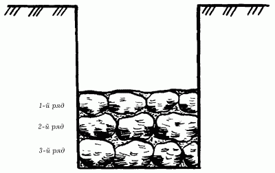 На бровке траншей глубиной 1,25 м расставляют ящики для раствора на расстоянии 4–5 м друг от друга. Бутовые камни укладывают между ящиками раствора. В процессе кладки камни подают помощнику непосредственно в руки, а не кидают вниз.