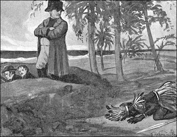Местные береговые обитатели, чистокровные негры, принадлежавшие к одному из кафрских племен, обнаружив пребывание белых, окружили их лагерь, явно выражая воинственные намерения. Негров этих было, считая женщин, свыше двух сотен человек. Вооружены они были луками, грубо выкованными ножами, топорами и ассегаями или метательными копьями. Побережные обитатели Южной Африки давно уже, — с тех дней, когда португальцы принялись отыскивать морской путь в Индию, — познакомились с белыми, и на свою беду познакомились с огнестрельным оружием белых. Поэтому они благоразумно держались вдали от спутников Наполеона, но издали метали в них стрелы и копья, к счастью, не достигавшие назначения.