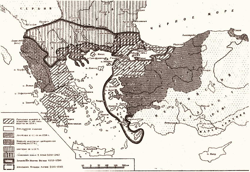 Эпир и прилегающие к нему земли Средней и Южной Македонии были заселены многочисленными народами. В Южном и Среднем Эпире жили греки. На севере — албанцы, в Македонии — славяне и валахи. Разные области нового царства сильно отличались друг от друга по своему культурному, экономическому и социальному развитию. Местами, особенно в долинах, здесь было развито крупное землевладение. Феодалы имели свои войска и большую власть. Но по соседству сохранялась масса свободных земледельцев-крестьян и горцев-пастухов. Особенно это было заметно в высокогорных районах Эпира и Македонии. Большая часть населения этой земли исповедывала Православие, хотя здесь же встречалось много беглых еретиков. Все это были вольнолюбивые и свободные люди, ненавидевшие западных завоевателей, несущих с собой крепостное право и религиозный гнет латинства. Эпирские правители могли быстро собрать боеспособное войско и активно вести войну с Латинской империей. Правда, царская власть в Эпире была намного слабее, чем власть императора в Никее. Крупные феодалы чувствовали себя здесь очень самостоятельно. В правление Феодора Ангела (1215-1224 гг.), преемника Михаила, феодальная раздробленность усилилась. Правда, царь смог разгромить латинских рыцарей и захватить королевство Фессалоники. В Северной Греции образовалась Фессалоникийская империя (1224-1230 гг.). Но вскоре она распалась на несколько крупных феодальных владений {145} .