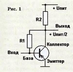Так что, изменяя малый ток базы, мы получаем большие изменения тока коллектора. Включив в цепь коллектора сопротивление нагрузки R2, получим усиленный сигнал на выходе. Простейший способ вывода транзистора на рабочий режим — включить между коллектором и базой резистор смещения R1. Его подбирают так, чтобы постоянное напряжение на коллекторе относительно общего провода (земли) равнялось примерно половине напряжения питания U пит/2. Искажения сигнала при этом минимальны. Легко сообразить, что если ток базы I bв Враз меньше тока коллектора I с, то R2 = B•R1.