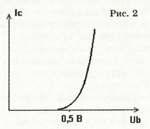 Он имеет базу — полупроводниковую пластинку с p– проводимостью (носители заряда положительные) и два контакта с n– проводимостью — эмиттер и коллектор. На коллектор подают напряжение питания положительной полярности. Но ток из эмиттера пойдет лишь тогда, когда на базу подано положительное напряжение смещения U b, для распространенных кремниевых транзисторов около 0,5 В (рис. 2).