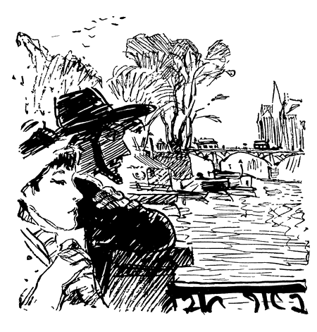 На первом плане, как раз под ними, была пристань св. Николая: виднелись низенькие помещения конторы судоходства; отлогий мощеный берег был завален грудами песка, бочонками и мешками; у причала стояли неразгруженные баржи, около них сновали толпы грузчиков, а надо всем этим возвышался гигантский подъемный кран; на другой стороне реки виднелся полоскавшийся по ветру серый полотняный навес купальни; запоздалые купальщики барахтались в воде, взвизгивая от холода. Середина реки была совершенно свободна, и маленькие волны отсвечивали белыми, голубыми и розовыми рефлексами. На втором плане виднелся мост Искусств, его высоко поднятый железный остов, казалось, был сделан из черного кружева, по узкому настилу моста, как муравьи, сновали пешеходы. Сена катила свои воды дальше, туда, где вырисовывались заржавленные арки Нового моста. Налево река была видна на большом расстоянии, вплоть до острова Сен-Луи; ослепительное сверкание водного зеркала преломлялось в перспективе; другой, короткий рукав был прегражден шлюзом Монетного двора, который пенившимися волнами наглухо закрывал вид. На Новом мосту большие желтые омнибусы и пестрые фургоны проносились через равные интервалы, как заводные детские игрушки. Окаймляла этот пейзаж отдаленная перспектива обоих берегов: на правом берегу группа высоких деревьев наполовину закрывала стоявшие вдоль набережной дома, а за ними, на самом горизонте, на беспорядочном фоне предместья выделялись стены ратуши и квадратная колокольня Сен-Жерве; на левом берегу виднелось крыло Академии, плоский фасад Монетного двора и деревья, рядами уходившие вдаль. В центре этой необъятной картины, словно нос старинного корабля, из реки поднимался, заслоняя небо, остров Ситэ, извечно позлащенный закатными лучами. На валу мощно зеленели тополи, загораживая собой статую Генриха Четвертого. Солнце проводило резкую границу между двумя рядами зданий, погружая в тень серые дома набережной Орлож и пламенея на румяно-алых домах набережной Дез-Орфевр; в неправильной линии домов благодаря освещению можно было различить мельчайшие детали: магазины, вывески, вплоть до занавесок на окнах. Выше, среди кружева труб за наклонными шахматными досками кровель, вздымались каменные башни Дворца правосудия и крыша Префектуры, подобная шиферной скатерти, срезанная колоссальной голубой рекламой, написанной на стене и, словно символ лихорадочного века, запечатлевшей лик города гигантскими буквами, видными во всех концах Парижа. А еще выше, надо всем этим и над башнями-близнецами собора Парижской богоматери, как гордые мачты векового корабля, плывущего по небу в величии и славе, вонзились в небо две стрелы цвета старого золота — шпиль собора и шпиль Сент-Шапель, очерченные с таким тонким изяществом, что, казалось, дуновение ветерка может их поколебать.