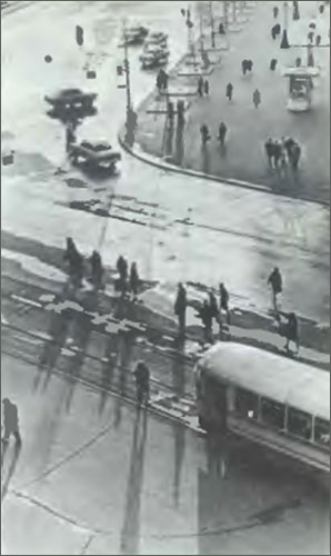 При верхней точке съемки фигуры и предметы проецируются на фон земли, а это подсказывает зрителю, что они, как бы прижатые к земле, потеряли свою высоту, принижены (фото 19). В ряде случаев такая проекция может быть выгодной, так как фигуры четко рисуются на фоне горизонтальной плоскости поверхности земли. Важно также, что кроме изменения рисунка изображения, геометрии кадра, здесь возникают своеобразные психологические оценки происходящего. Верхние точки способствуют также выразительному показу широкого пространства и выявлению расположения фигур и предметов в этом пространстве.