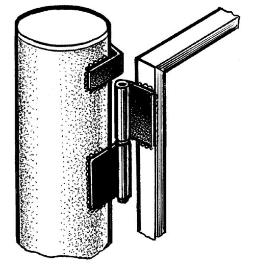 При монтаже выбранное положение упора-ограничителя отмечается на столбе мелом, после чего на нем сваркой фиксируются петли с таким расчетом, чтобы ось петли совпадала с угловым ребром упора-ограничителя, установка которого на место является завершающей операцией. Между верхушкой петли упором-ограничителем обеспечивается зазор, в пределах которого возможно вертикальное перемещение створки калитки. Аналогичное решение нетрудно использовать и для случая деревянной конструкции калитки на деревянном же столбе.