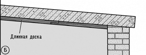 Один конец длинной доски шипом вставлял в паз более короткой, уже закрепленной и передвигался к противоположному незафиксированному концу. Размечал и сверлил первое отверстие, забивал дюбель и шурупом временно закреплял свободный край длинной доски. Она оказывалась плотно прижатой к потолку, что позволяло разметить три-четыре отверстия по всей ее длине. После установки дюбелей можно было крепить доску окончательно.