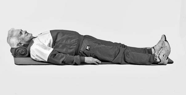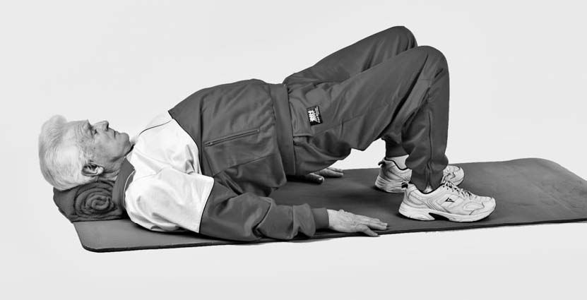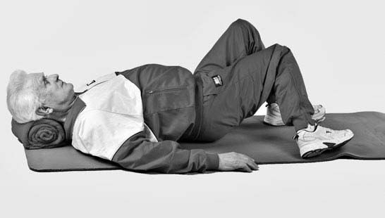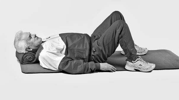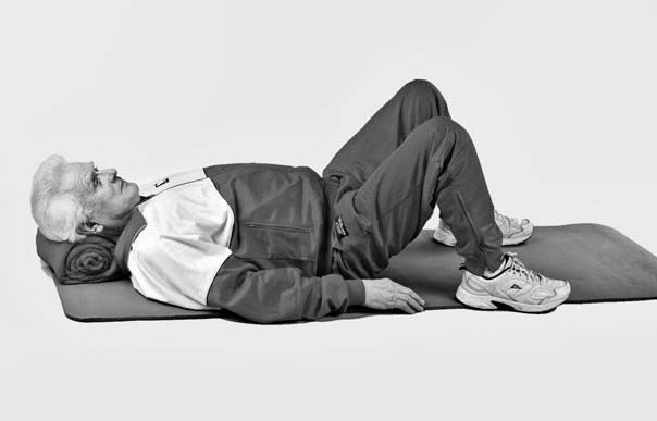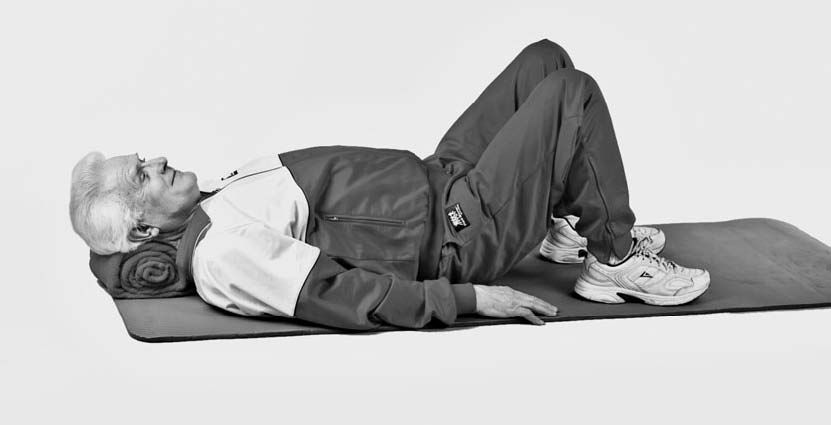 Исходное положение: лежа на спине, ноги согнуты в коленях, руки расположены вдоль туловища или под головой (кому как удобно).