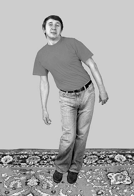 Исходное положение: стоя прямо и ровно. На счет «раз» сделайте движение бедрами вперед и одновременно шумный короткий вдох носом. Затем выполните круговое движение бедрами (тазом) в направлении справа налево, при этом происходит абсолютно пассивный, невидный и неслышный выдох. Затем снова толчок бедрами вперед и короткий активный вдох с последующим вращением. И так далее. После 8 вдохов движений остановитесь и отдохните 3–5 секунд. Затем снова 8 вдохов-движений и отдых.