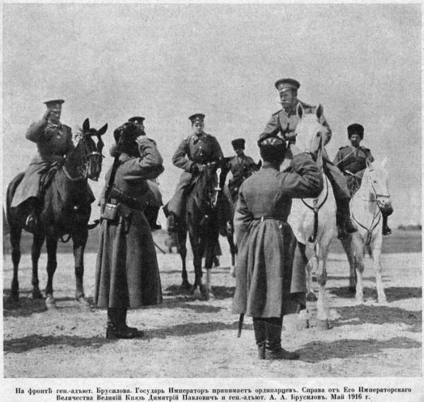 А. А. Брусилов встречает прибывшего на фронт императора Николая II.