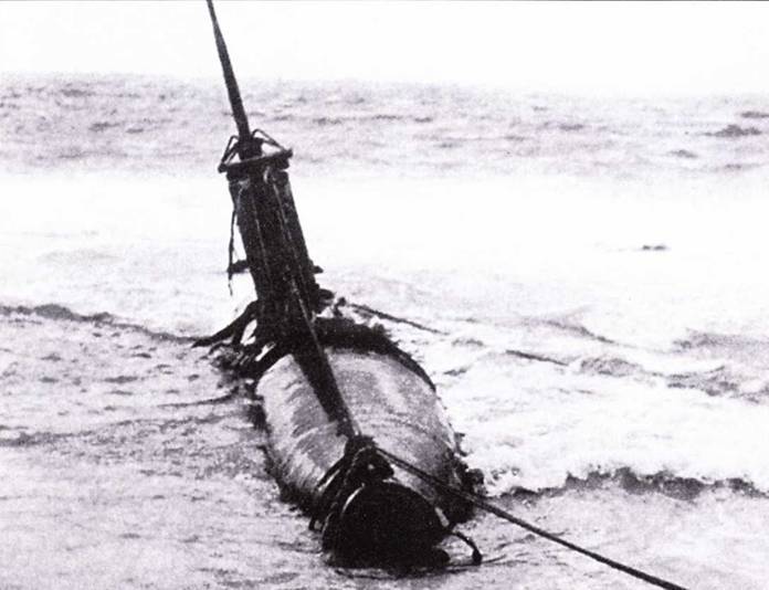 Японская сверхмалая подводная лодка после налета американской авиации.