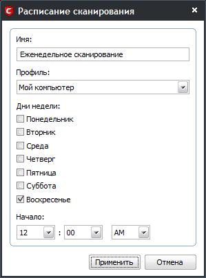 Запланированные сканирования – позволяет запланировать антивирусные проверки. Нажмите эту кнопку, и вы увидите список запланированных сканирований (рис. 7.9). Выберите еженедельное сканирование и нажмите кнопку Править. В открывшемся окне (рис. 7.10) вы увидите, что еженедельное сканирование запланировано на каждое воскресенье и будет произведено в 12:00. Если эти параметры вас не устраивают, измените их. Проверять компьютер чаще, чем раз в неделю, обычно нет необходимости, особенно, если вы не отключаете антивирус на протяжении недели;