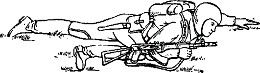 Для переползания по-пластунски (рис. 1) лечь плотно на землю, правой рукой взять оружие за ремень у верхней антабки и положить его на предплечье правой руки. Подтянуть правую (левую) ногу и одновременно вытянуть левую (правую) руку как можно дальше;
