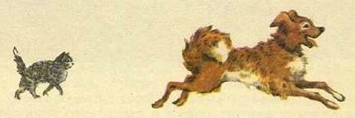 А потом Найда схватила в зубы котёнка и во всю прыть понеслась с ним по двору. Ребятишки никак не могли её догнать.