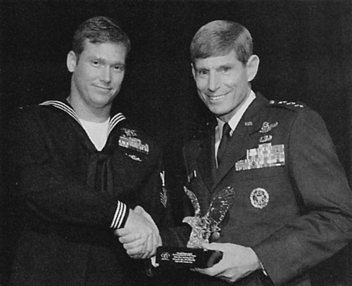 Начальник штаба ВВС генерал Нортон Шварц пожимает мне руку при вручении премии «Благодарная нация» Еврейского института по вопросам национальной безопасности. Эту награду присудили мне в 2005 году в знак признания моих заслуг и достижений в Фаллудже.