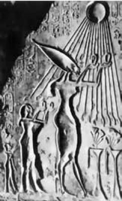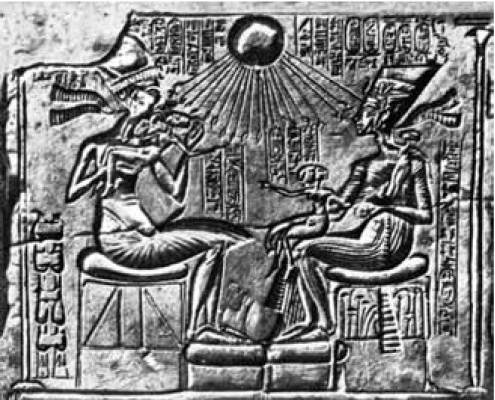 Поклонение Атону (слева). Рельеф из храма Атона в Ахетатоне. XIV в. до н. э. Фараон Эхнатон с женой и детьми, осеняемый лучами Атона (справа). XVIII династия