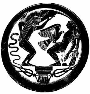 Атлант и Прометей, которого терзает орел. Фрагмент росписи чернофигурного лаконского килика. Ок. 550 до н. э.
