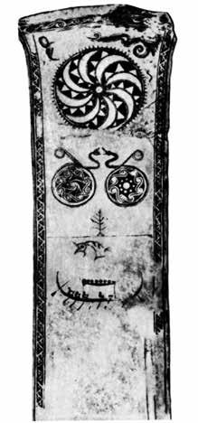 Вариант картины мира в германо-скандинавской мифологии (верхний мир – солярные знаки, средний мир – дерево, нижний – погребальная ладья). Памятный камень с острова Готланд. V–VI вв.