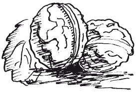 Грецкий орех. Под прочной скорлупой находится золотистое ядро с повышенным содержанием белка: 1 кг грецких орехов заменяет 2 кг белого хлеба и 1 кг говядины. В составе грецкого ореха 60 % растительных масел, минеральные вещества, витамины, фитонциды, но в нём нет витамина С.