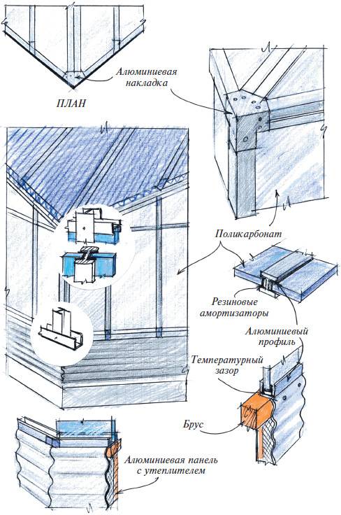 Современные конструкции таких помещений состоят из двух-трех взаимодополняющих материалов. Наиболее распространены сегодня три варианта конструкций: из алюминия в сочетании с пластиком, где пластик препятствует промерзанию металла; из пластика в сочетании со сталью, где сталь несет основные конструктивные нагрузки, из древесины в сочетании с алюминием, где металл защищает дерево от непогоды.