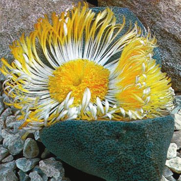 РОД PLEIOSPILOS N. Е. BR. – ПЛЕЙОСПИЛОСМноголетние травянистые бесстебельные растения, одиночные или образующие за счет боковых побегов колонии. Одно растение состоит из одной-двух, реже трех-четырех пар очень толстых листьев, сросшихся в основании, серо-зеленых, с прозрачными точками. Нижняя сторона листа сильно выпуклая. Цветки сидячие или на очень короткой цветоножке, крупные (6–8, реже 3–4 см в диаметре), желтые, открываются в полдень и при увядании краснеют. Название рода происходит от греч. р1ео – весь, полностью и spilos – точка. Родина 34-х видов – ЮАР (Капская провинция). Все они растут на раскаленном каменистом субстрате; очень напоминают камни и в нецветущем состоянии неотличимы от них. Народное название – «живой гранит».