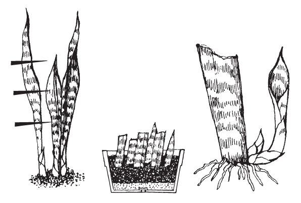 Особенности размножения некоторых видовСемейство Агавовые (Agavaceae). Агавы размножаются «детками», вырастающими возле материнского растения. Сансевиерии – в основном делением корневища, а растения без полос на листьях – делением листа (это довольно длительный процесс). Сансевиерии с полосами при размножении листом теряют полосы.