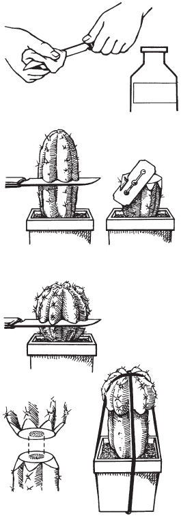 Вегетативное размножение . В большинстве случаев для суккулентных растений намного более результативным является вегетативное размножение. Оно представляет собой размножение стеблевыми и листовыми черенками, делением кустов, отпрысками, отводками, прививками и т. д., наиболее распространено черенкование. Этим способом легко размножаются представители семейства толстянковых, асфоделовых, портулаковых; труднее черенкуются молочаи и очень трудно гудия, декабелоне, трихокаулон из семейства ластовневых.