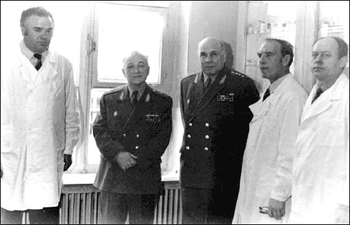 Слева направо: доцент С. Ф. Фролов, генерал-майор мед. службы И. А. Юров, академик РАМН, начальник ЦВМУ, генерал-полковник мед. службы Ф. И. Комаров, завкафедрой, профессор В. М. Виноградов, доцент Л. В. Пастушенков.