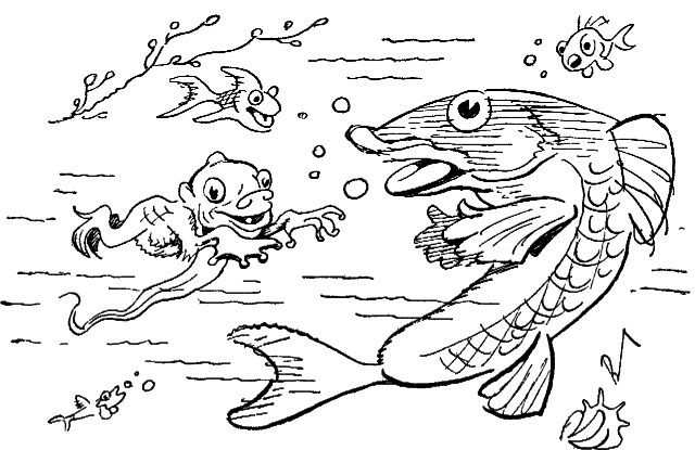 Открыл Кузька рот, чтобы ответить, а вылетел изо рта только писк. Хотел Кузька руками взмахнуть, а вместо рук у него плавники. А таймень превратился в молодого красавца со злым взглядом зеленых глаз.